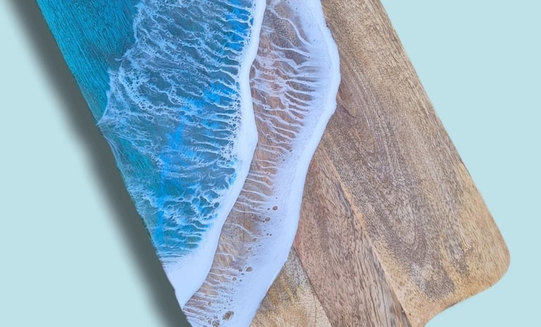Our ocean resin art and natural wood pieces turn any room into a calm, breezy escape.